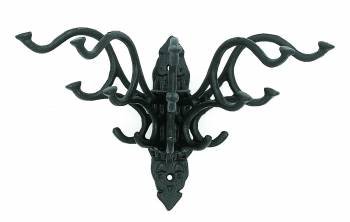 5 Hook Coat Hat Wall Rack This awesome Cast Iron Wall rack will look great in your home or outside in the yard. It can be used for hats and coats or as a decoration on the patio with flowers. As you can see in my pictures it has a pre drilled hole in the center for easy hanging. The wall mount stands 6.5" long the hooks are 7" long and protrude outward no more than 6.5". This item is in great condition.
